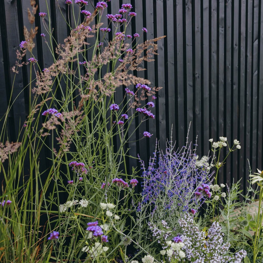 - Mostly hardy perennials and structured shrubs that return year after year.